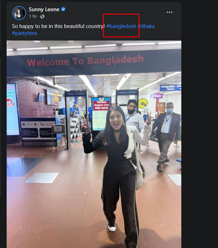 ছবিটির ক্যাপশনে সানি লিখেছেন, ‘এই সুন্দর দেশটিতে এসে খুব খুশি আমি।’ এর সঙ্গে হ্যাশট্যাগে #বাংলাদেশ #ঢাকা #পার্টিটাইম শব্দগুলো জুড়ে দিয়েছেন। এতে বাংলাদেশ নামের বানান ভুল লিখেছেন এই অভিনেত্রী। তিনি লিখেছেন- Bangledesh!
